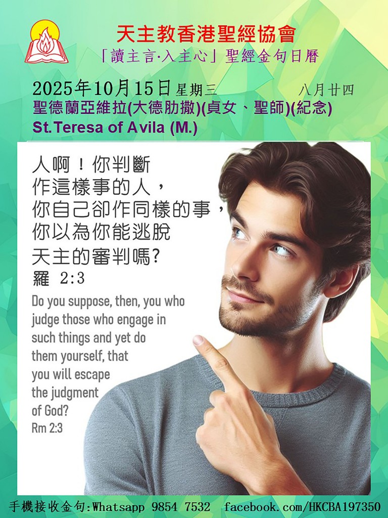 人啊!你判斷作這樣事的人,你自己卻作同樣的事,你以為你能逃脫天主的審判嗎?