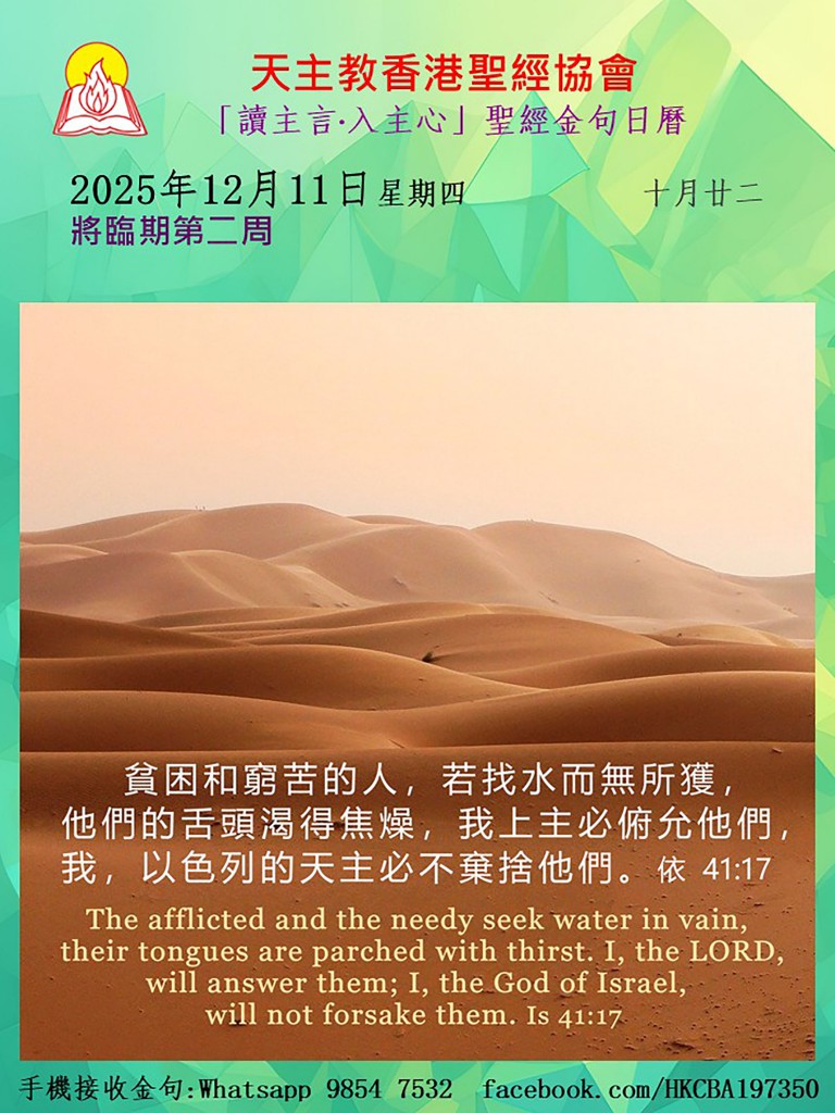 貧困和窮苦的人,若找水而無所獲,他們的舌頭渴得焦燥,我上主必俯允他們,我,以色列的天主必不棄捨他們。